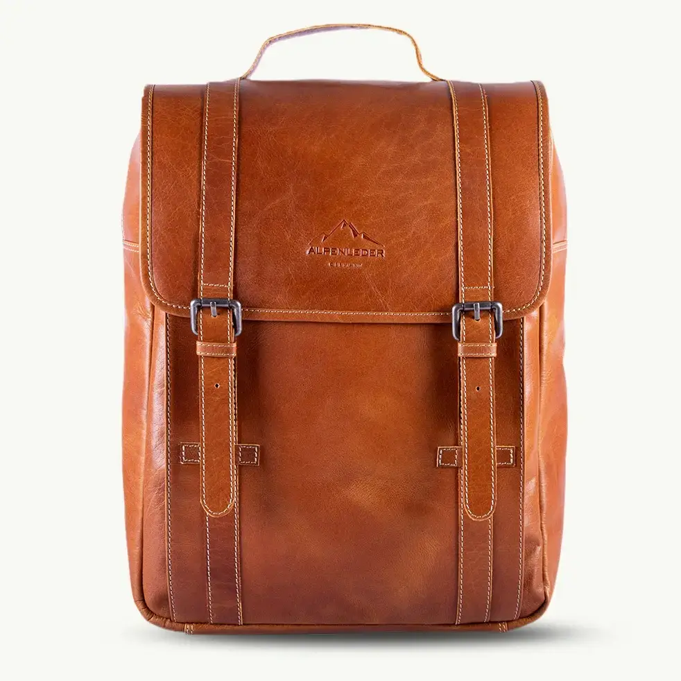 En rygsæk i læder, der er særdeles slidstærk, rummelig og anvendelig i hverdagen.